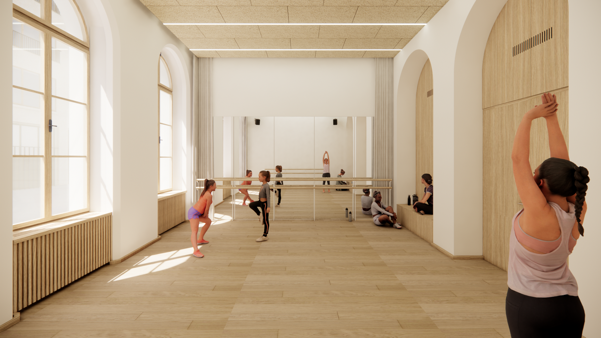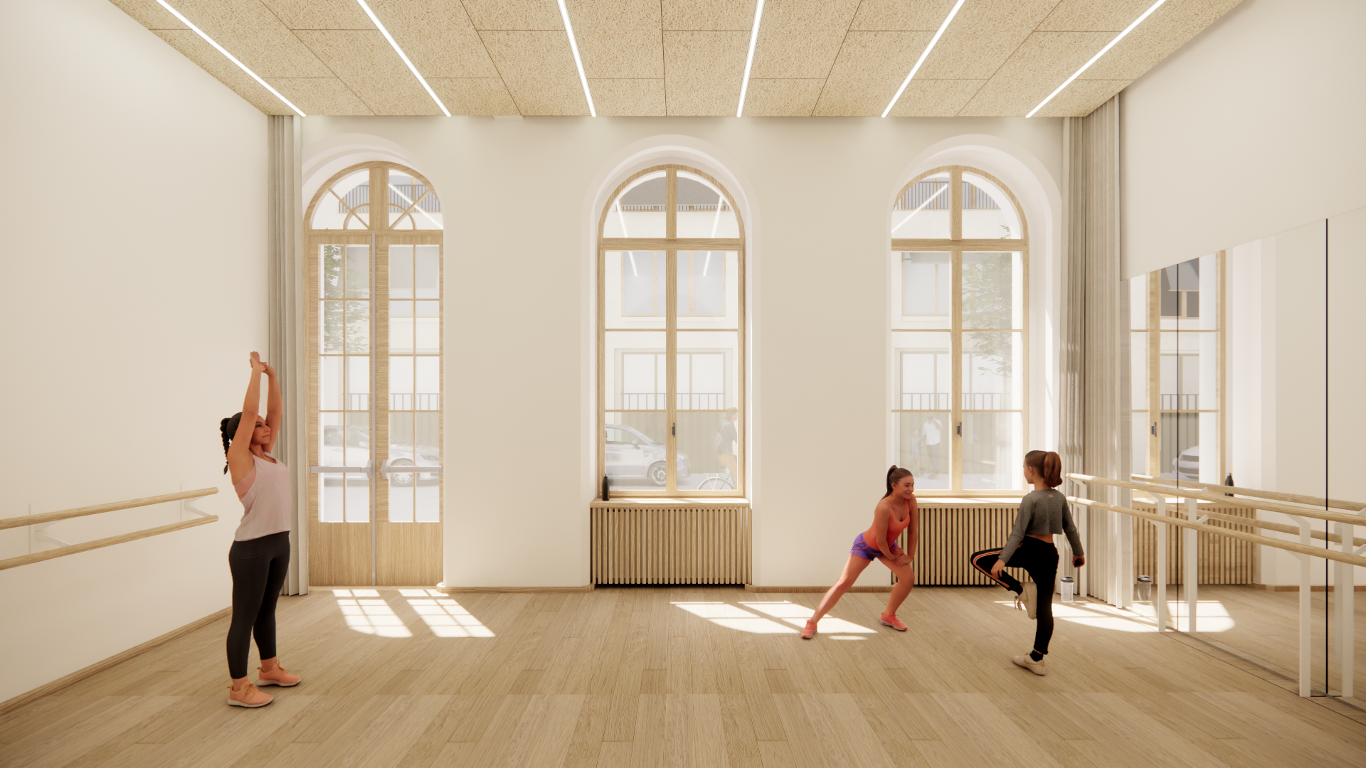 Le rez de chaussée est ainsi totalement transformé, transformant le hall d’entrée du Conservatoire, abritant deux nouvelles salles d’enseignement musical, ainsi qu’une nouvelle salle de danse, mettant en valeur les arches existantes, trace d’une extension précédente. Au premier étage, un pole de bureaux et espace de travail dédié à l’administration est créé. Enfin, au deuxième niveau, les vestiaires de la grande salle de danse sont intégralement repensés.