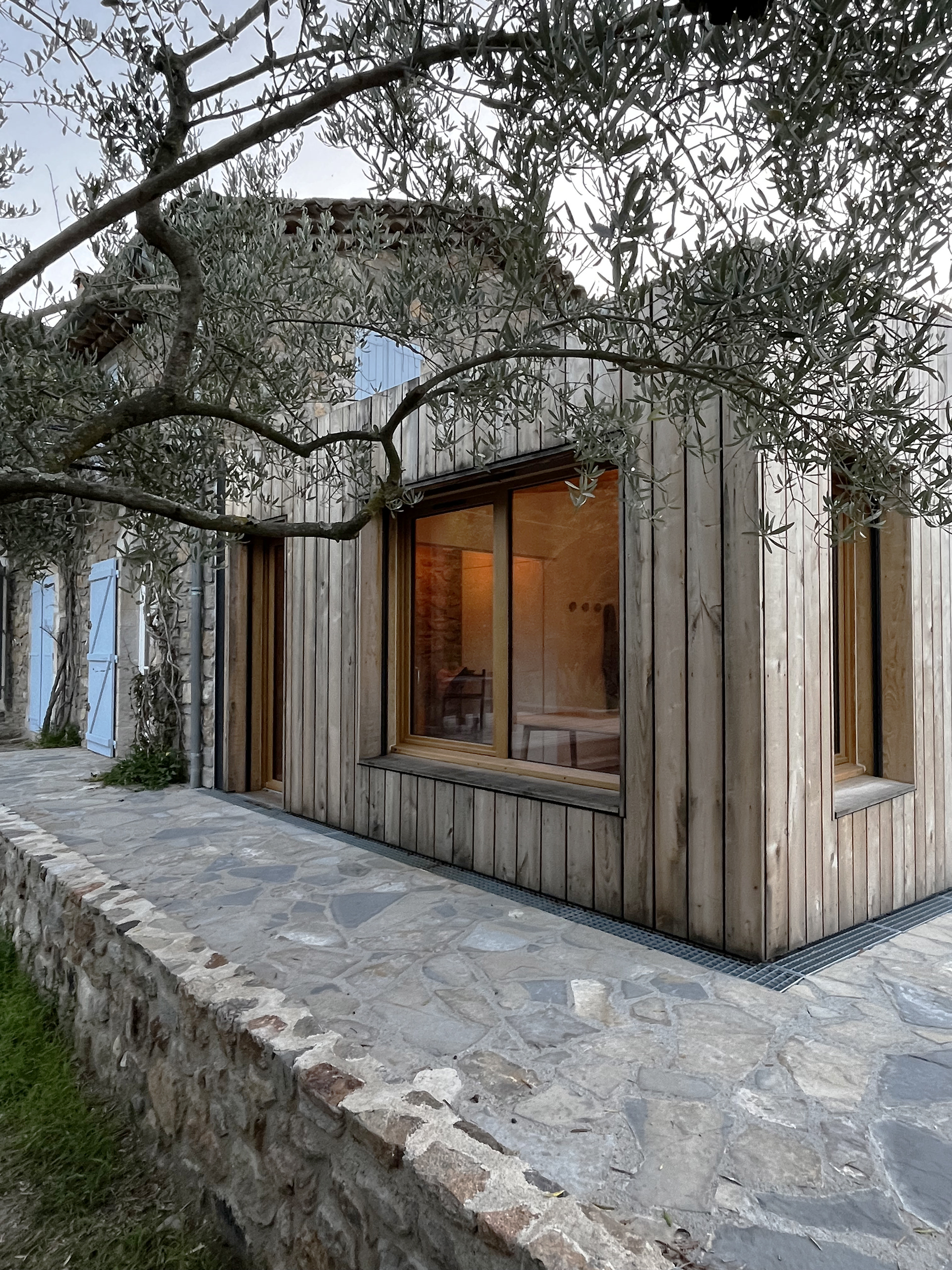 Enfin, l’édifice est construit entièrement avec des matériaux locaux, qu’il s’agisse de la structure en ossature bois, du bardage en châtaignier ou des divers éléments en pierre aménagés sur la parcelle.