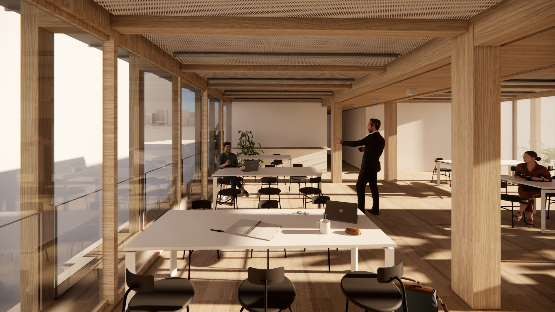 Le bâtiment est surélevé d’un niveau, permettant d’offrir de nouveaux espaces communs de qualité ainsi qu’une terrasse accessible à tous les utilisateurs des bureaux. L’ensemble des espaces intérieurs existants sont rénovés, avec pour objectif l’amélioration de leurs performances thermiques et énergétiques, tout en réhabilitant les nombreux éléments à caractère patrimonial (escalier monumental, moulures et boiseries...). Le hall historique est intégré dans une nouvelle séquence d’entrée et les archives en sous-sol sont transformées en salles de réunion de standing.